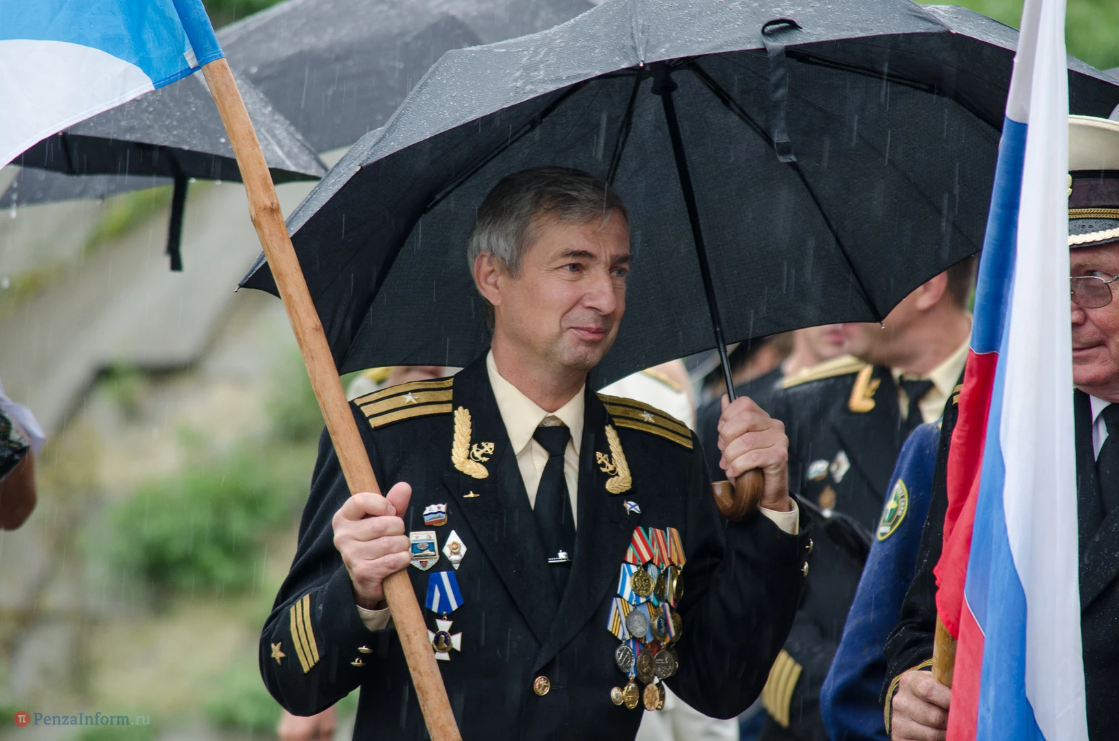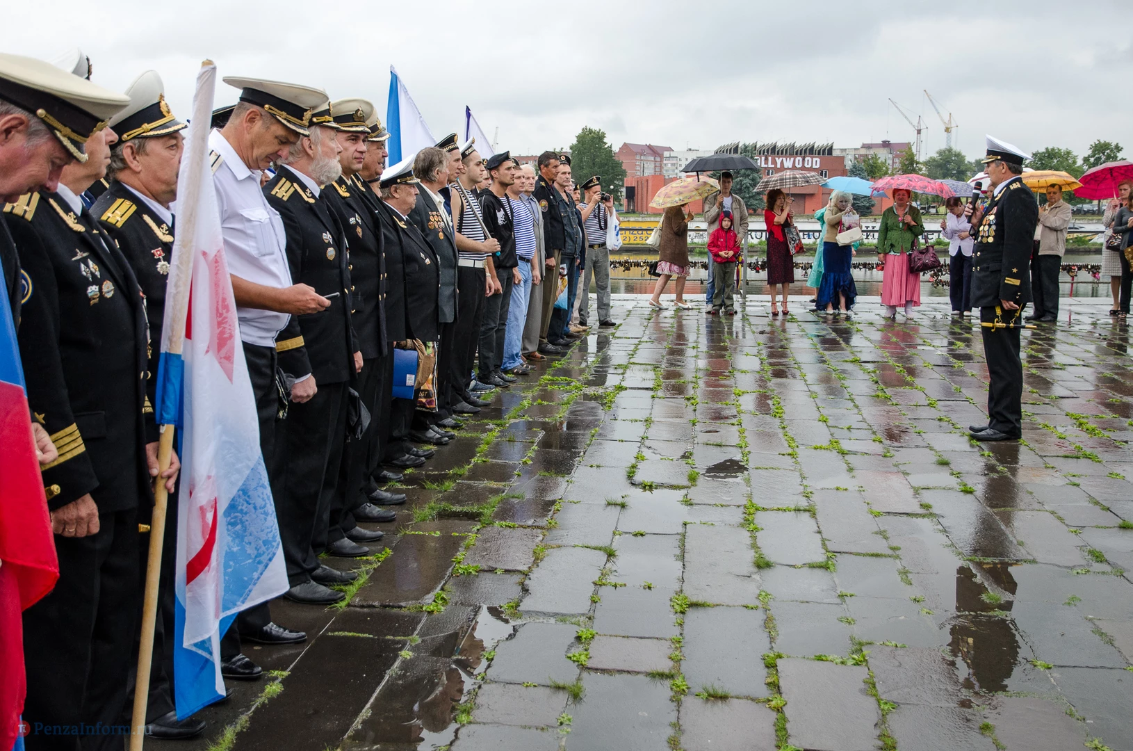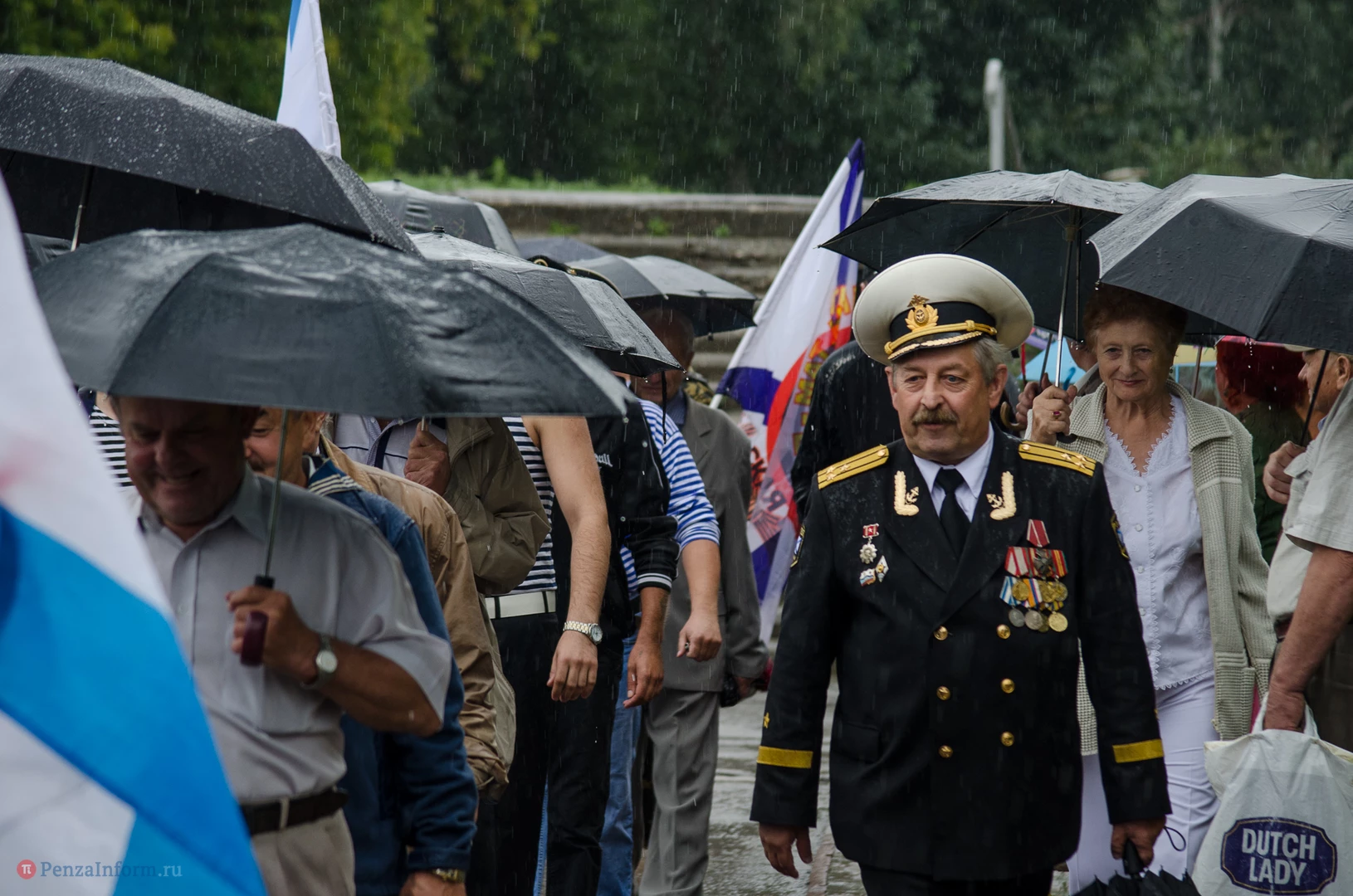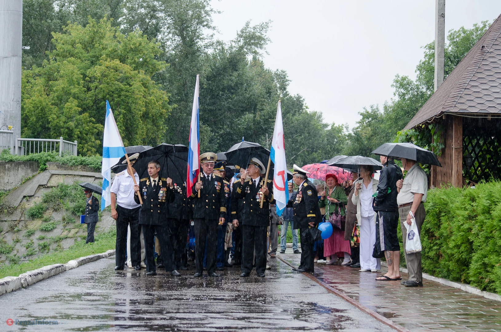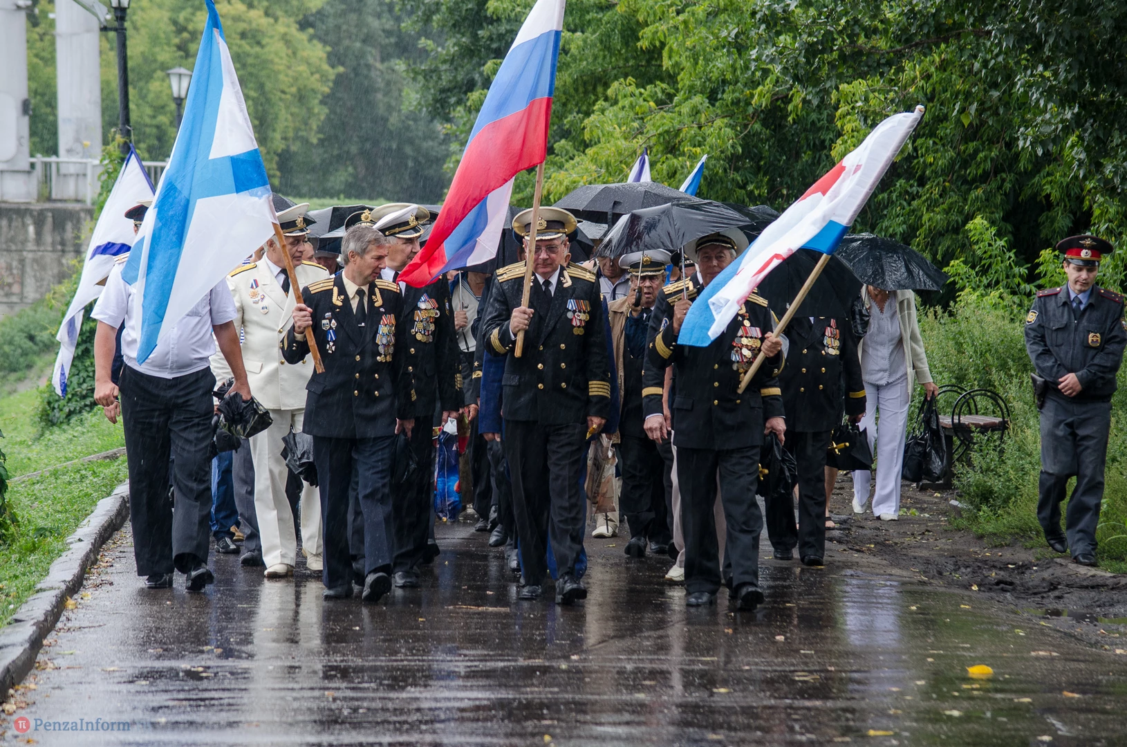 Региональная общественная организация «Пензенское морское собрание» торжественным маршем и построением отметила День ВМФ. Бывалым морякам ливень нисколько не помешал выслушать поздравления от молодежи, председателя Морского собрания, капитана 1-го ранга запаса, Цигвинцева Сергея Алексеевича и всех тех, кому дорог и близок этот день.